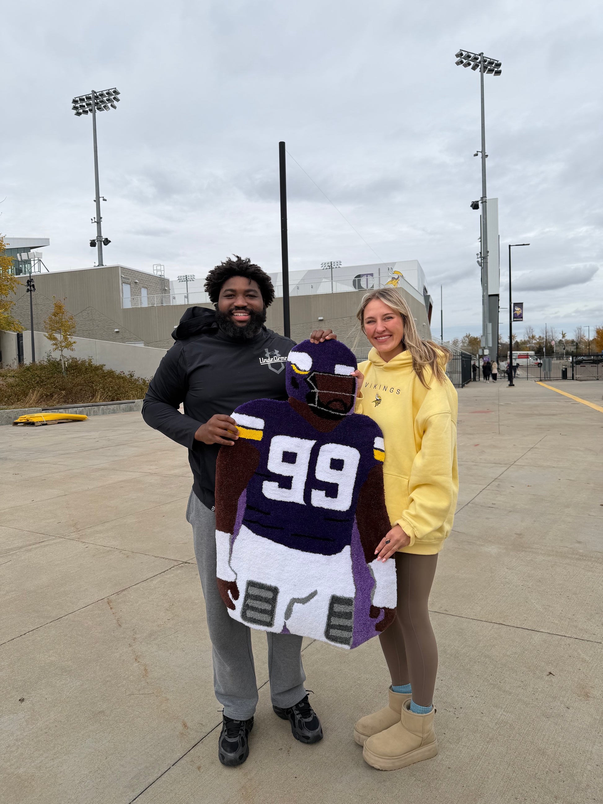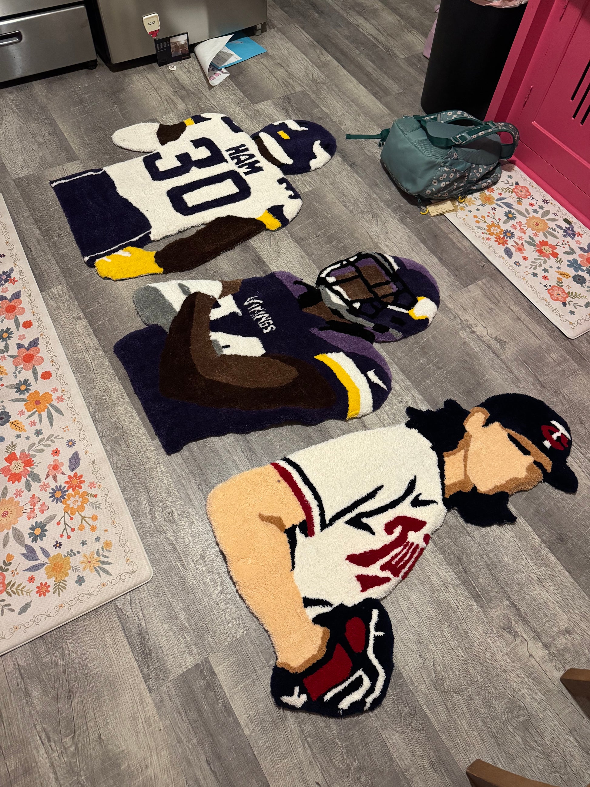 Each custom tufted rug is a handmade piece of art, crafted by me with care and attention to detail. These rugs feature football players, athletes, or any custom design you have in mind — made using acrylic yarn and a tufting gun, then finished with an adhesive backing and precision trimming to bring your vision to life. Whether displayed as wall art, a statement rug, or a creative room accent, each piece is designed to stand out and show off your favorite player or personal design.